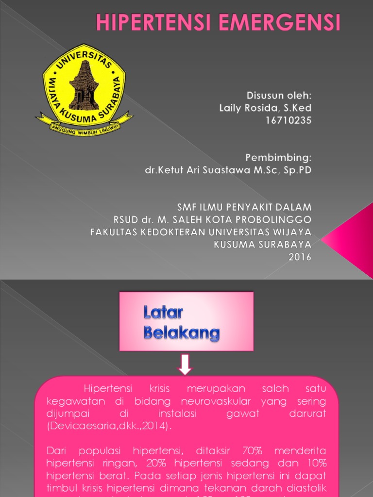 Hipertensi emergensi merupakan keliru satu jenis krisis hipertensi, di mana tekanan darah semakin tinggi 180/120 mmhg & disertai dengan gejala yg menandakan adanya gangguan organ misalnya nyeri dada, sesak napas, gangguan penglihatan, atau kesulitan bicara. Hypertensive emergencies encompass a spectrum of clinical presentations emergensi hipertensi in which uncontrolled blood pressures (bps) lead to progressive or impending end-organ dysfunction. in these conditions, the bp should be lowered aggressively over minutes to hours.
